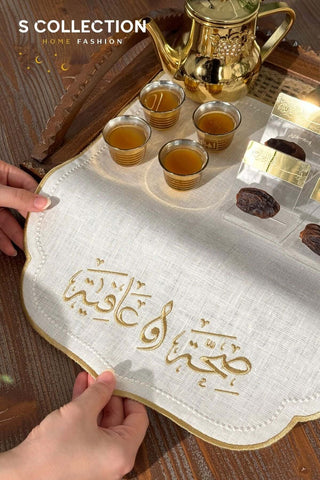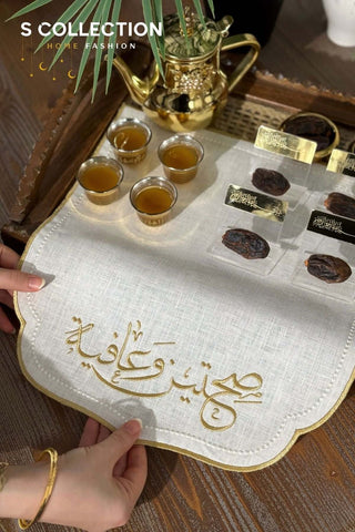 Sahtain wa Afia Design Tray Cover - %100 Linen Fabric - Gold Embroidered