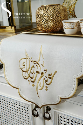 Eid Mubarak Mosque Design Runner - Waterproof Fabric - Gold and Silver Embroidered