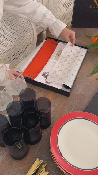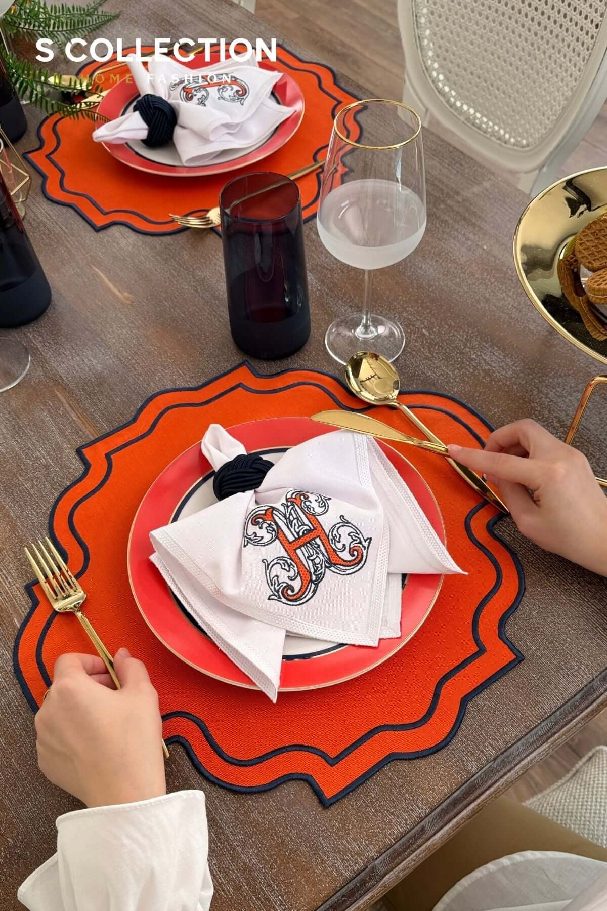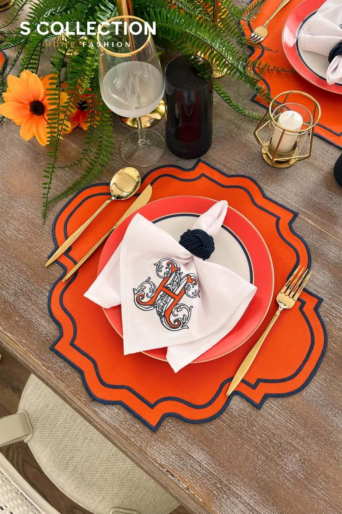 Alpabet H Design Embroidered Placemat Set - Orange Colour Waterproof Fabric - 6 Persons - 18 Pcs.