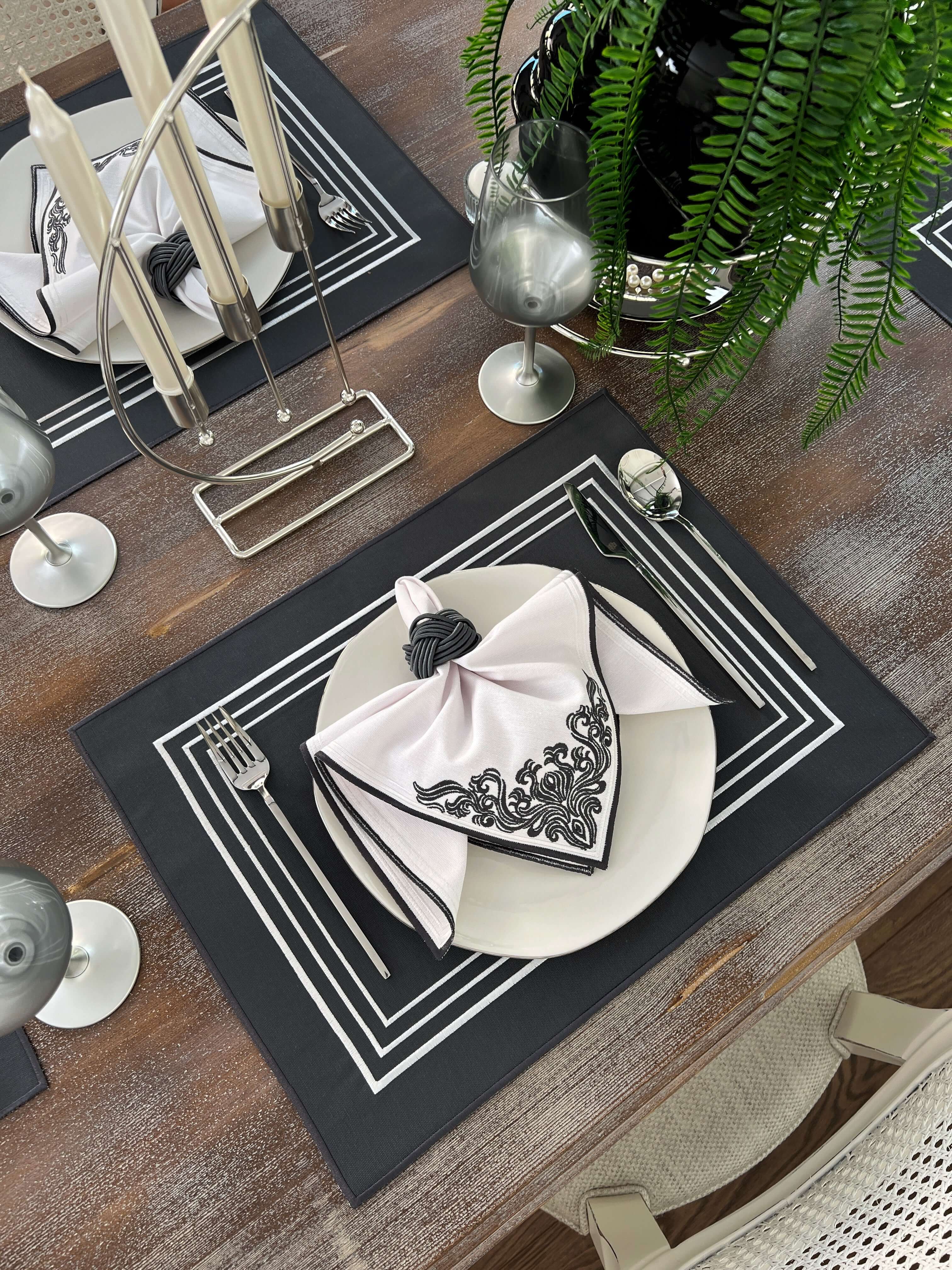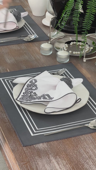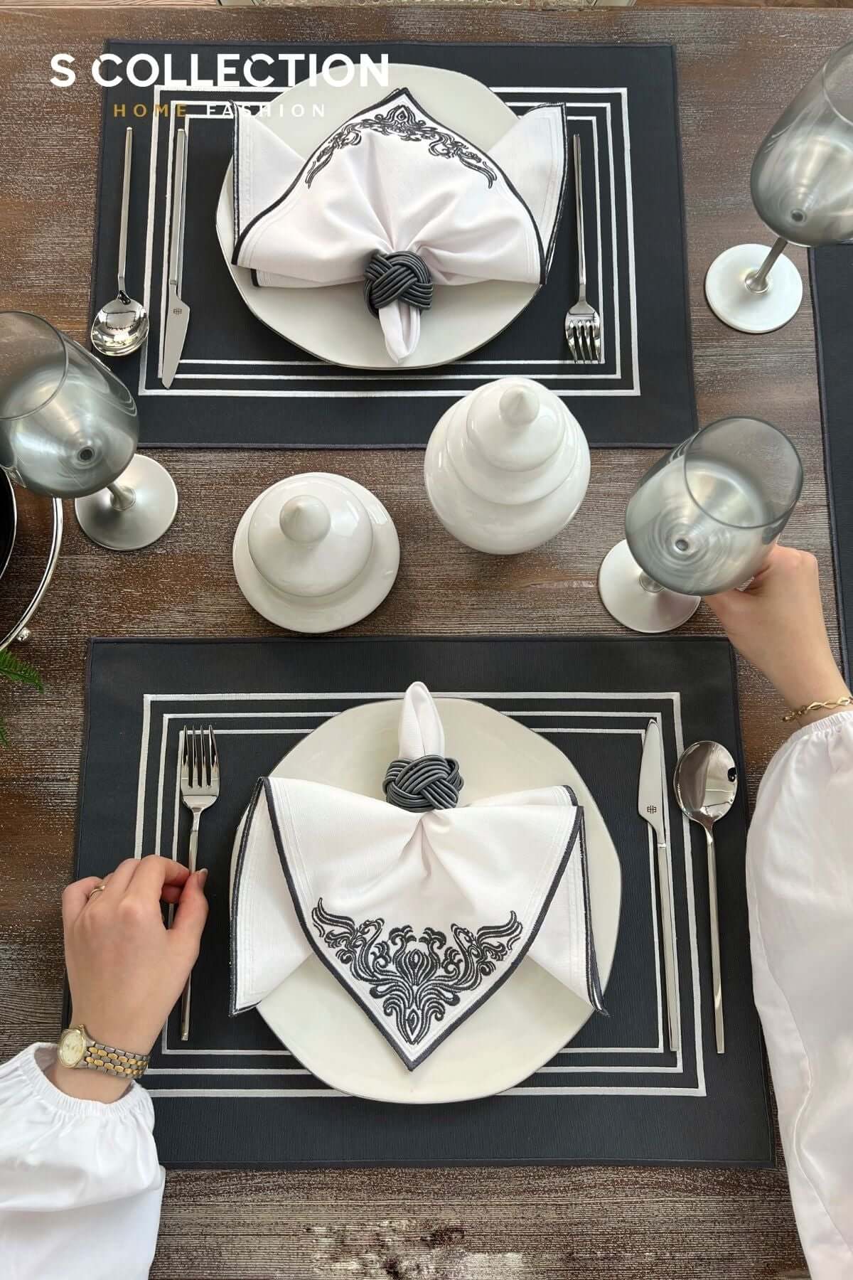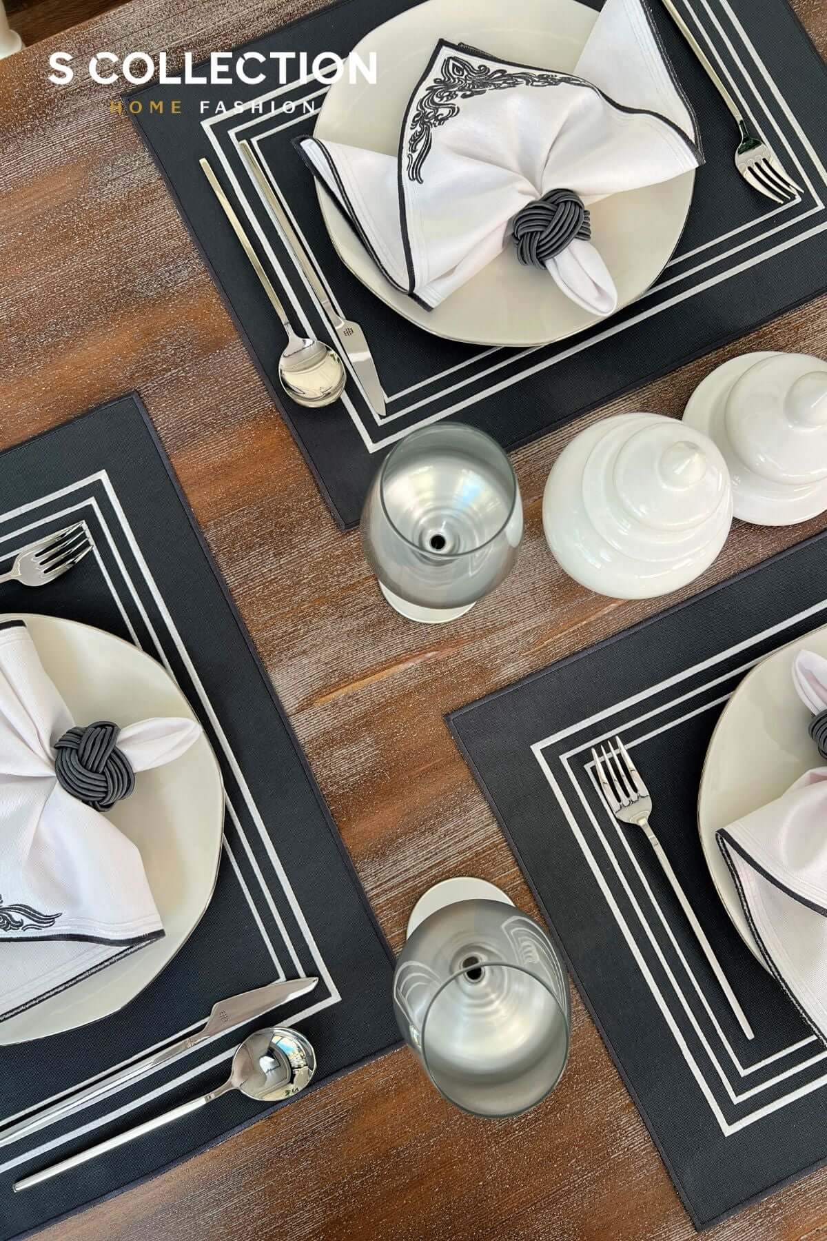 Silva Design Embroidered Placemat Set - Dark Grey Colour Waterproof Fabric - 6 Persons - 18 Pcs.