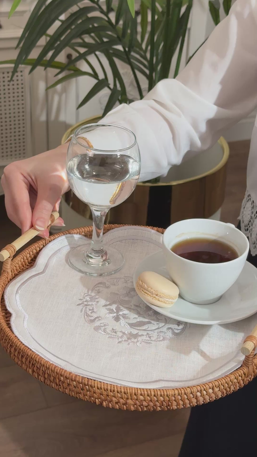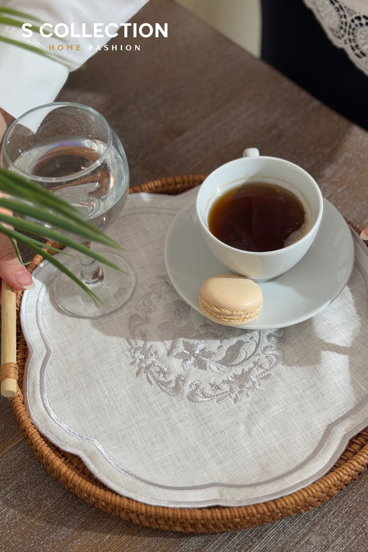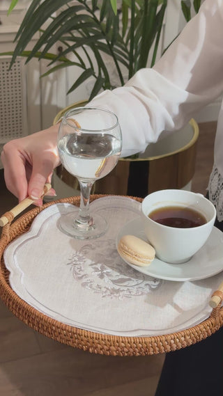 Elegant and handcrafted tray covers made from premium-quality linen with intricate embroidery, perfect for adding a touch of sophistication to your coffee or similar presentations for your guests.